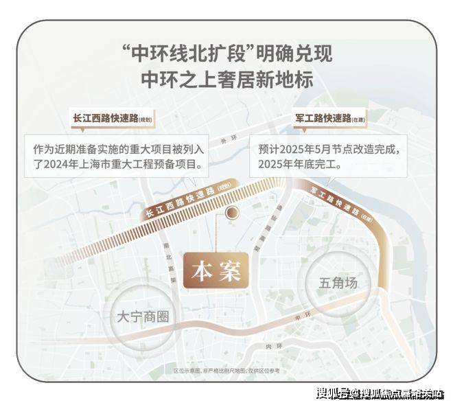地铁18号线横向拉通了原本纵向不相连的四线,将北上海横向联通,成为区域轨交的交汇聚点;项目紧邻长江西路地铁站(直线站五角场。中环线北扩段明确兑现,军工路快速路25年开工,长江西路快速路列入上海市重大工程清单预备项目,快速链通城心,随着中环线北扩段的政策明确,淞南将正式进入中环时间。未来经逸仙高架,进入南北高架、内环高架、中环高架,可快速链通南北上海;