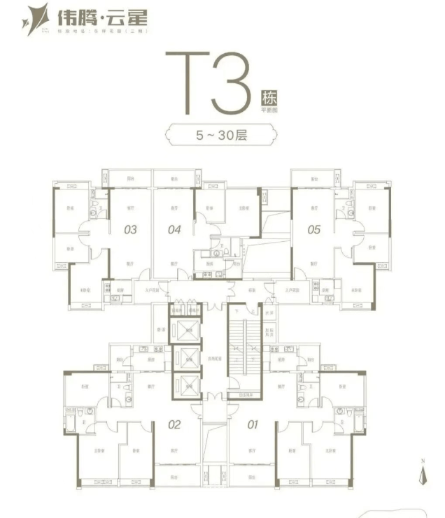 总楼栋数:规划共6栋住宅楼。其中,1-4栋为小高层洋房(13-18层),5-6栋(现推广名为T2、T3栋)为高层住宅(30层)。目前主要在售及推售的是T2、T3栋高层现房。