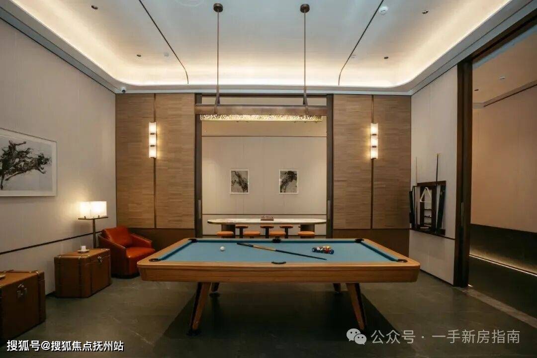 休闲沙龙区是日常社交核心:阅读区“穹顶”吊顶营造静谧氛围,成为孩子的专属书房;中央吧台软包防磕碰、石材好打理,白天是水吧夜晚变酒廊,搭配台球区的专业设施,让各年龄段业主都能找到归属。