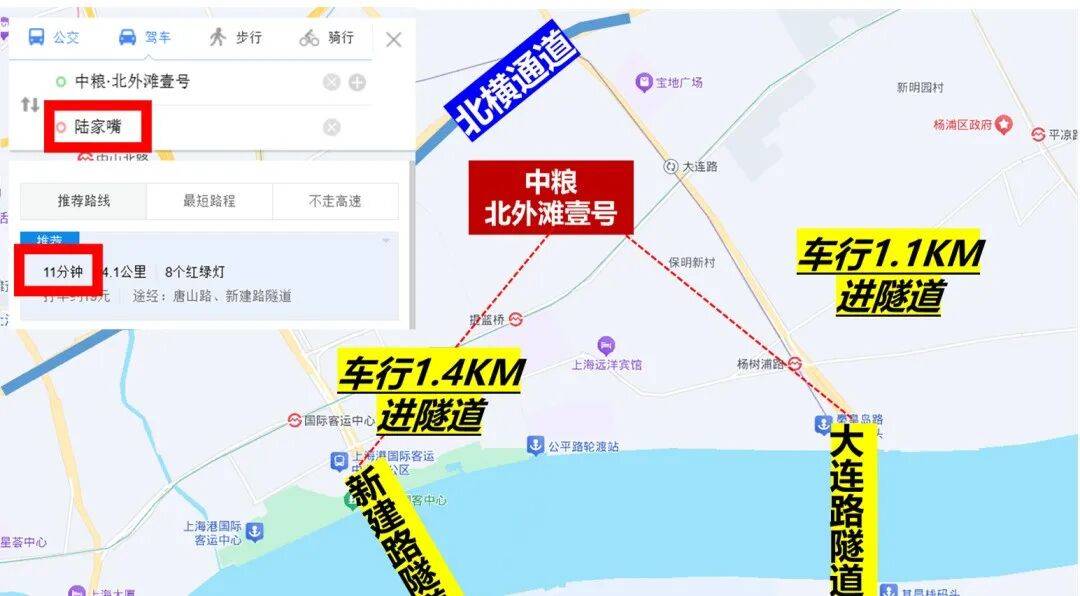 自驾上,项目往北约300米就是北横通道,往南车行约1公里,就是新建路隧道和大连路隧道直达浦东。从项目到陆家嘴、北外滩和外滩都在10分钟左右。