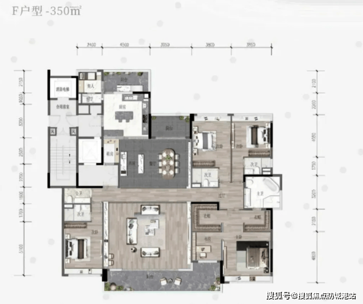 建面350㎡五房四卫是目前在售的大户型,五开间朝南设计,全屋采光无死角。约9米双面景观阳台,可灵活规划为茶室、瑜伽区或迷你菜园,满足多样化的生活需求。