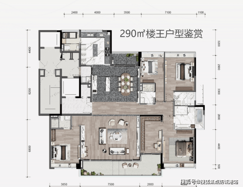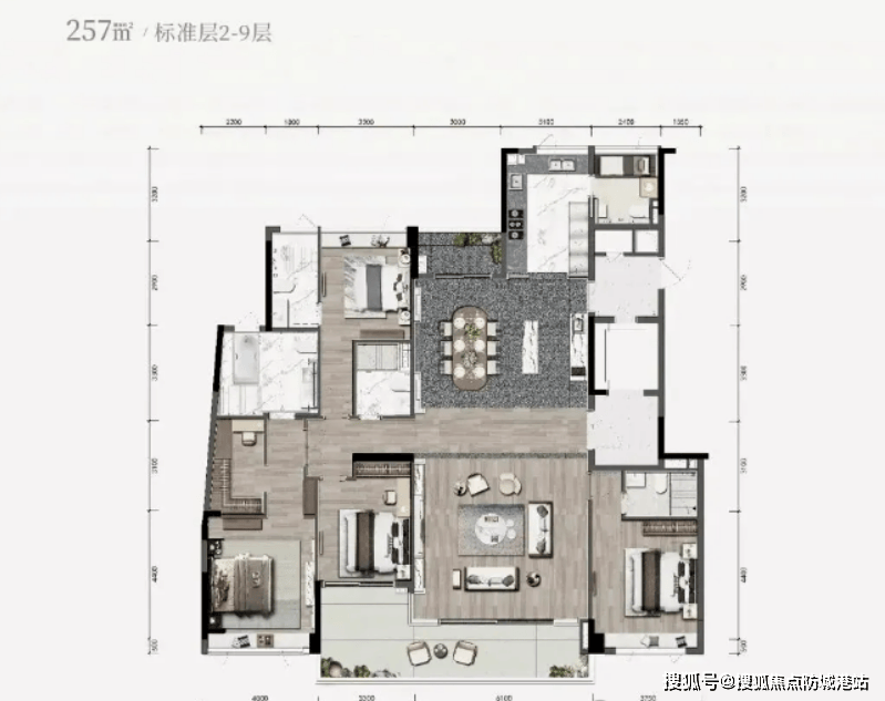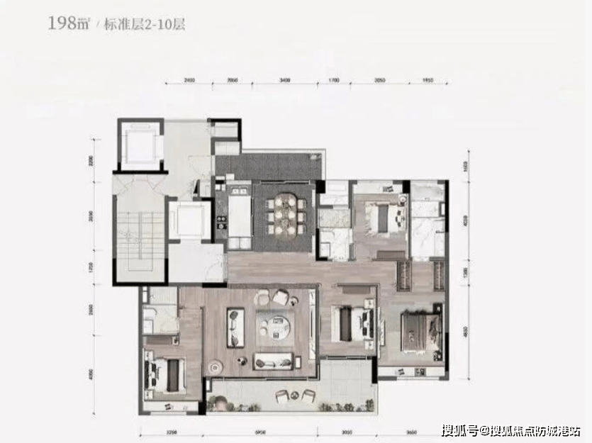 A4:目前在售户型包括建面197㎡四房两卫、257㎡四房三卫、290㎡四房四卫、350㎡五房四卫,全系大平层设计,三梯两户布局。