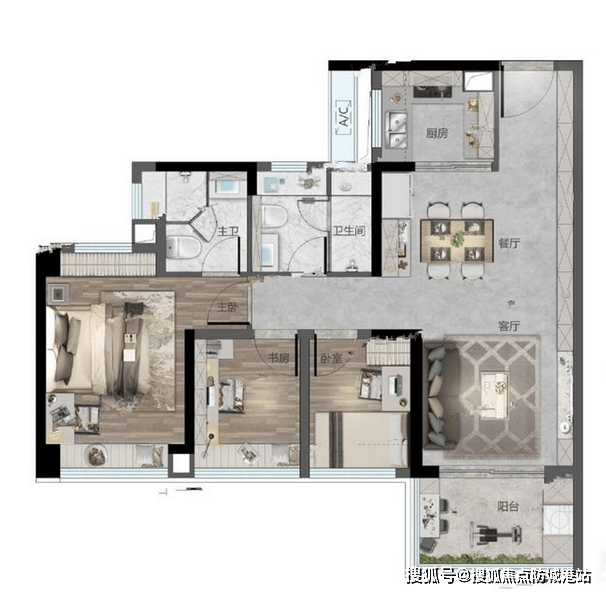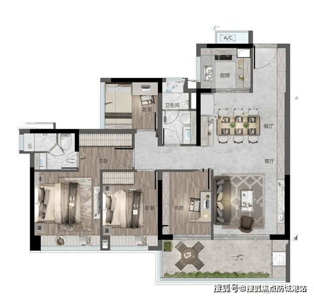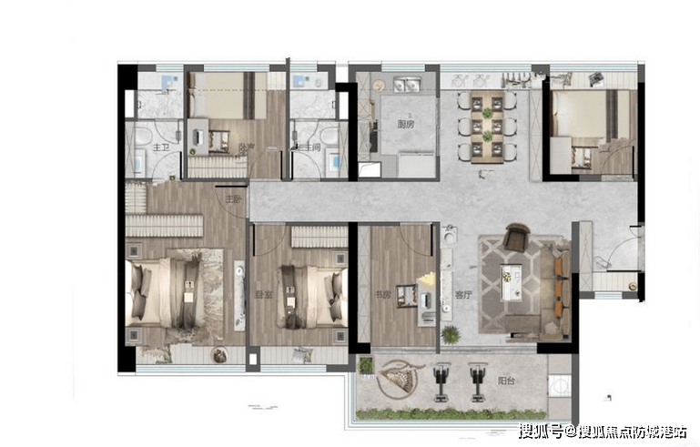 :主卧带 270°阳台,107㎡A 户型拥有 5.9 米长阳台,125㎡五房五开间朝南,空间感十足。